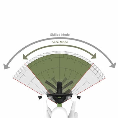 - Le mode Safe : qui autorise un angle de rotation de la direction réduit de 90°. Ainsi, le guidon ne se « plie » pas et l’enfant n’a pas à se soucier des virages brusques et peut se concentrer sur l’apprentissage de l’équilibre.